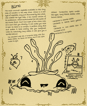 Each enchanted vegetable has different, well documented variations, from which you must choose correctly. So as to fulfil their requests, you should open the compendium, when left with questions.